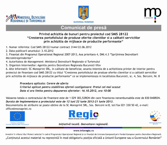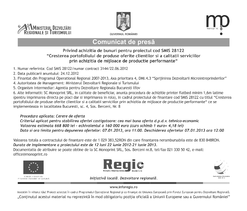 Pentru informatii suplimentare va puteti adresa la SC Monoprint SRL, Bucuresti, sector 4, sos. Berceni nr. 8, tel/fax: 0213305042, email: office@monoprint.ro